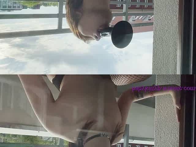 Honey who was showing off nude on the balcony of the building called a person from the street to screw