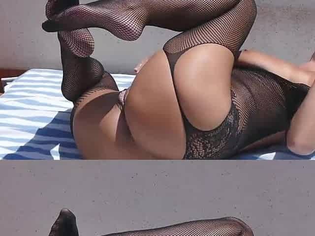 Outside on my balcony, wearing a black fishnet crotchless bodystocking, laid masturbating