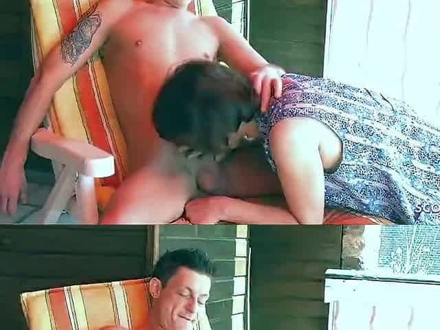 Mature woman giving a blowjob on the balcony