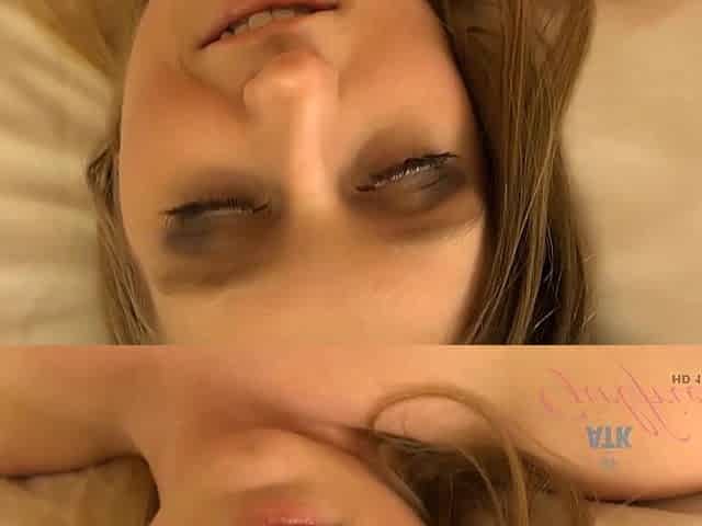 Pretty blond hottie with a perfectly bald vagina would like to get a creampie, after that babe cums