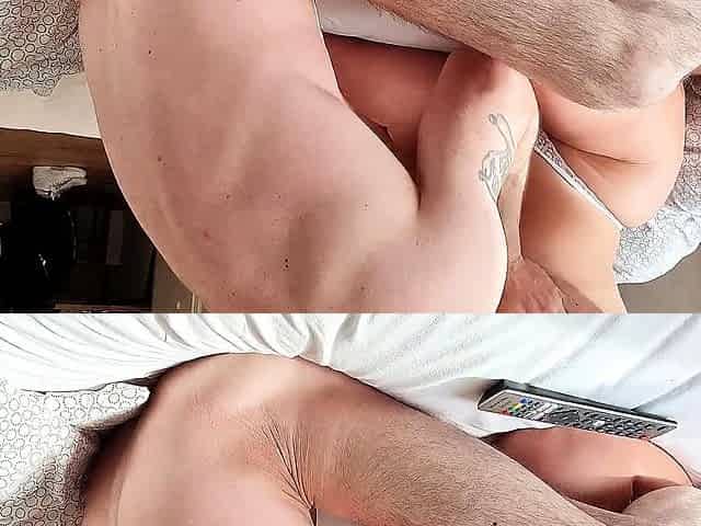 Insatiable hottie is toying her perfectly hairless cunt whilst having anal sex, to spice it up