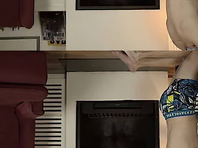 Hunk is licking babe's bald fur pie at the kitchen counter