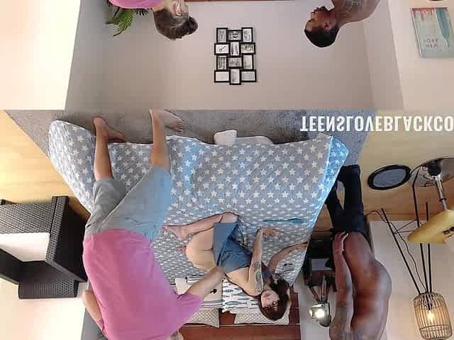 eighteen teen brunette hair girltake a large ebony rod in her bald cunt
