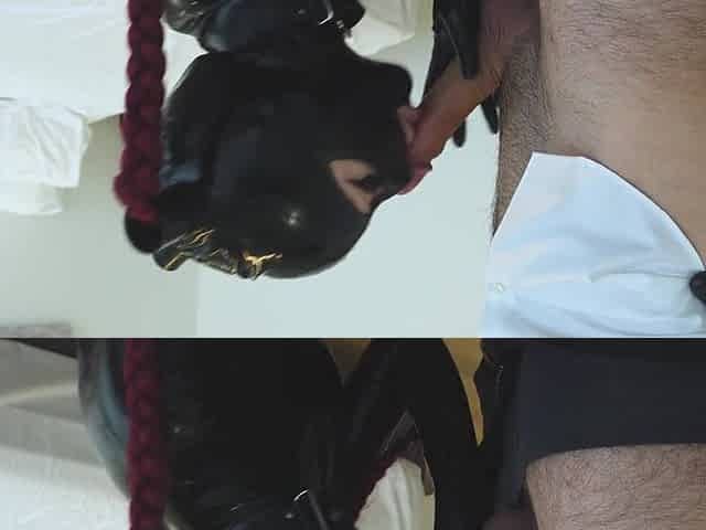 Latex sweetheart with nice-looking eyes sucks knob and gets load on face