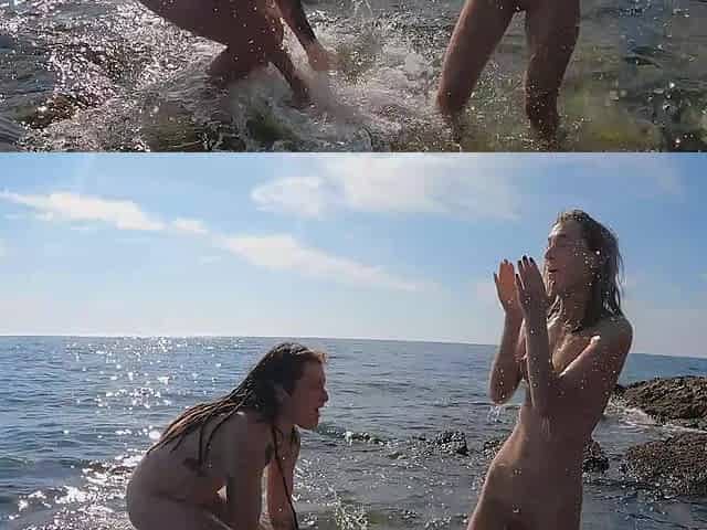 Poppy And Brille Swimming Nude On A Rocky Beach And Eating Bananas