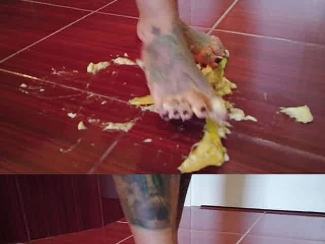 A banana is trampled by a blonde tattooed MILF
