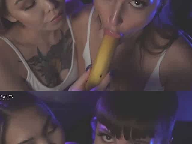 Two girls suck a dildo and a banana