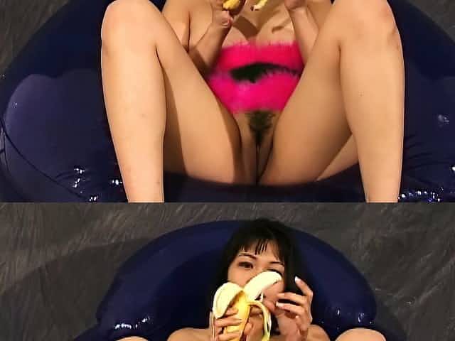 Asian gal Mika Tan fucks herself with a banana and then eats it