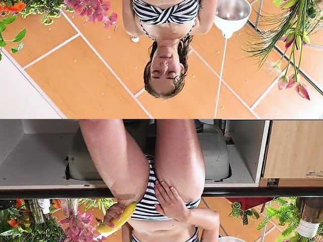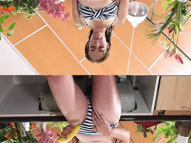 Nasty teen brunette hair, Lis Xxx is masturbating with a banana and groaning from joy whilst cumming