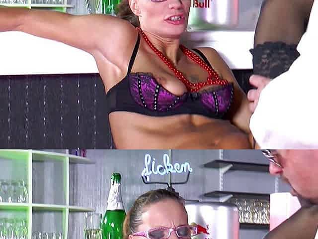Blonde hottie licks MILF's ass and pussy on bar counter