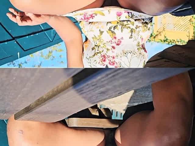 Hubby touches my cunt in a beach bar with me clothed in a taut shirt and short petticoat, no pants.