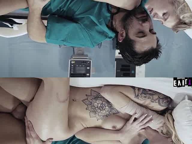 Skinny tattooed blonde Kate Bloom's steamy blowbang session with plenty of action
