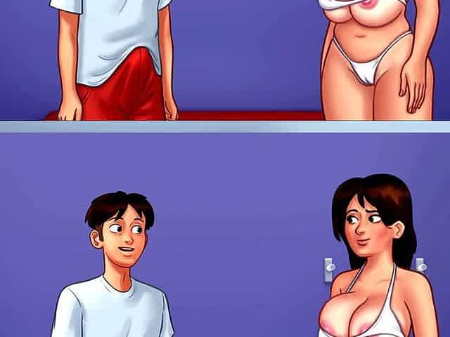 Busty cougar struggles to fit in her sexy white bikini during summertime saga