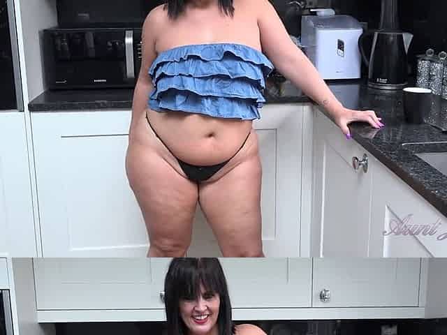 Playful Latina BBW housewife Montse gives a deep-throat blowjob in the kitchen