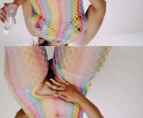 Sexy babe in kinky gimp outfit pleasures herself by fingering her wet pussy