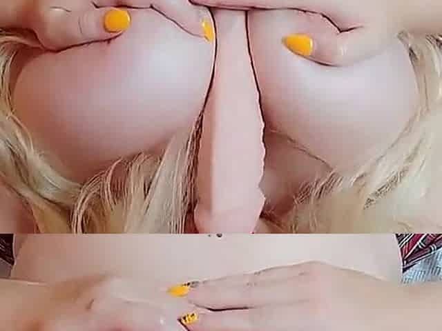 Stunning big-boobed blonde Riley Evans sticks a dildo in her crack