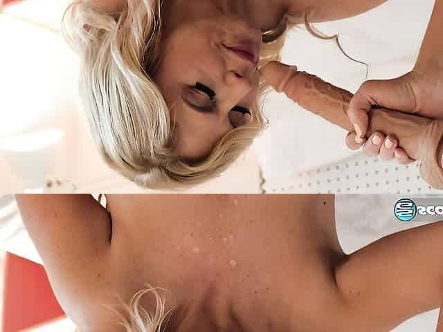 Busty blonde Violetta likes sucking her massive rubber dildo