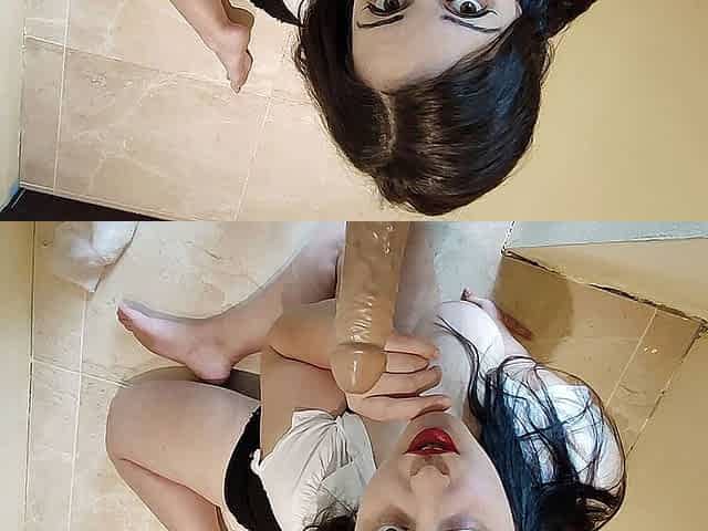 Bbw shows off blowjob skills with dildo on her sliding glass door