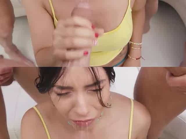 Selbe Lynn gets pounded by three guys, explodes with pleasure, and receives multiple BBC facials