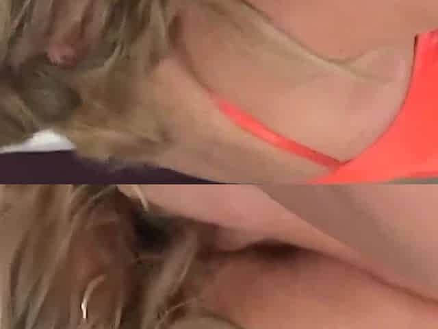 Big tits blonde Edina in thong, fetish wear, goes lesbian.