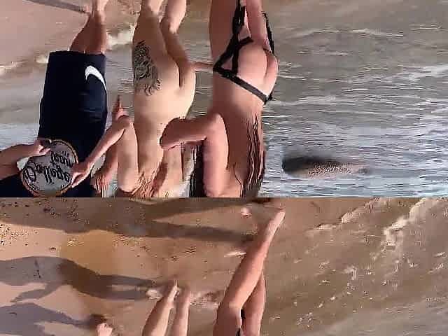 3 hawt lesbian babes sunbathing on a public beach and screw with a ding-dong