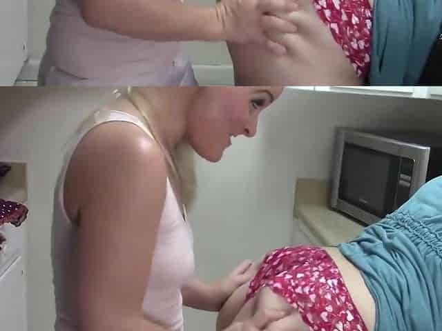 Girl with big tits and small tits rub pussies on my legs