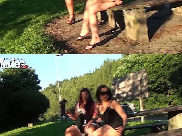 Horny brunette lesbians licked sweet kitties of each other on fresh air