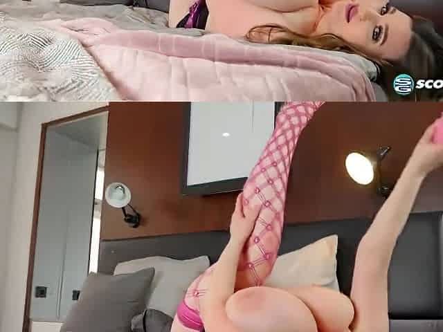 Voluptuous blonde cougar is wearing sexy lingerie and stockings during solo cunny masturbation