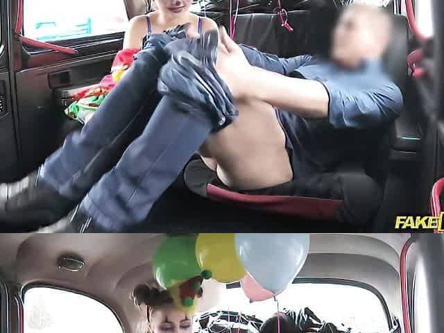 Clown girl Lady Bug opens her shaved pussy on the backseat