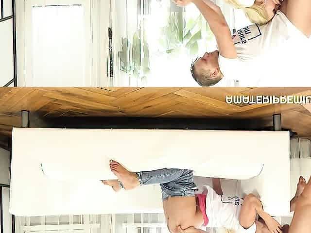 Naughty blonde babysitter in denim shorts takes a big hard cock