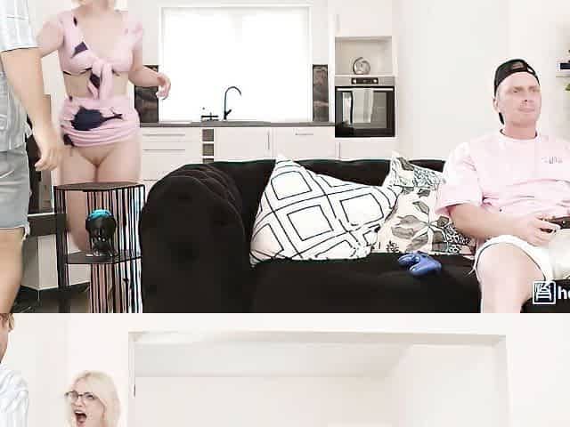 Blonde in glasses Eliz Benson fucked by two huge dicks in the bedroom