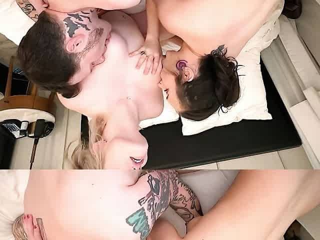 Two sexy girls shared a massage with a hot guy, oiled up.