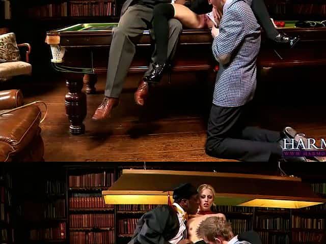 Bonny blond sex doll in nude stockings gets fucked by 2 beefcake boys