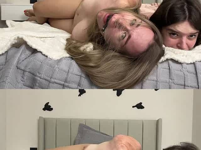 Two Horny Sluts Pleasing a Tied up Blonde Babe