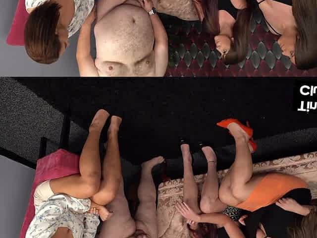 Fatty dude with small chopper humiliated by CFNM femdom gro