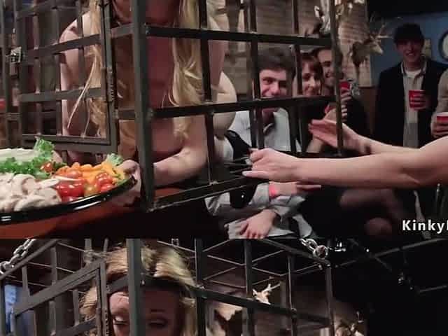 Blonde In Cage Serve Food In Public