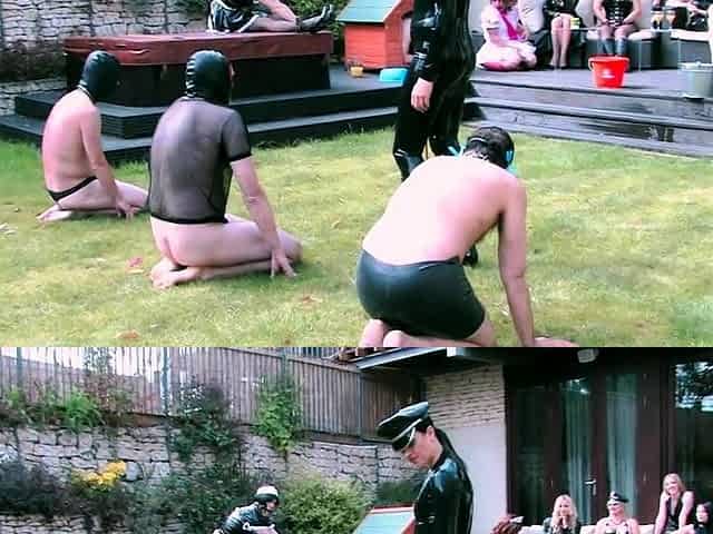 Strapon latex domina fucks subs ass in CFNM femdom sex