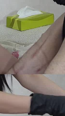 a hotty with a large booty with pink neon socks on her feet is awaiting for u to fill her booty with semen