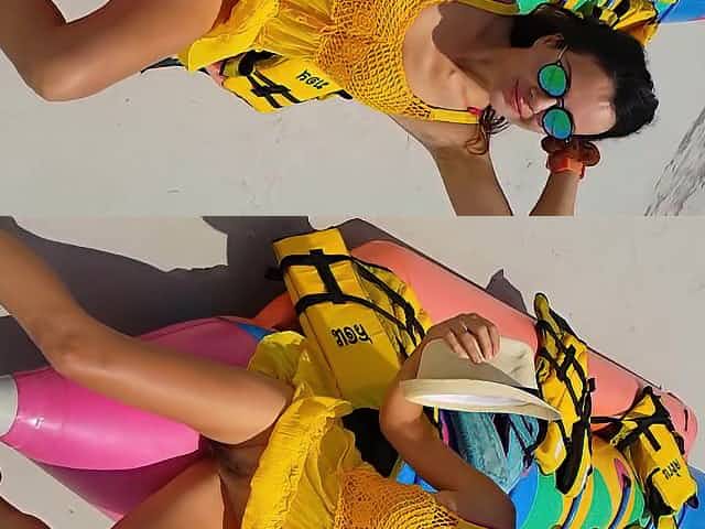 Asian babe on the beach fingers her tight pussy