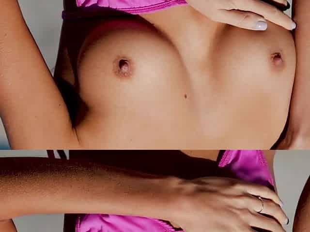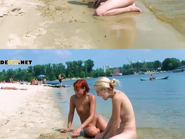 Slim and nude beach girl is trying to catch some sun as she displays her firm breasts
