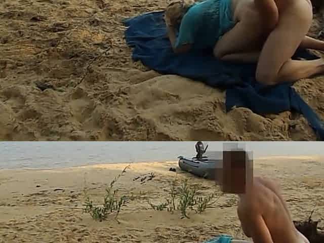 Hiding on the beach, looking at a sunbathing woman, close-up of her pussy and tits