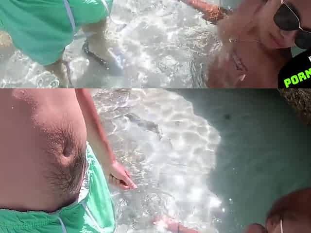 MILF jerking off stepson's cock in the sea while her husband went for a cold lemonade