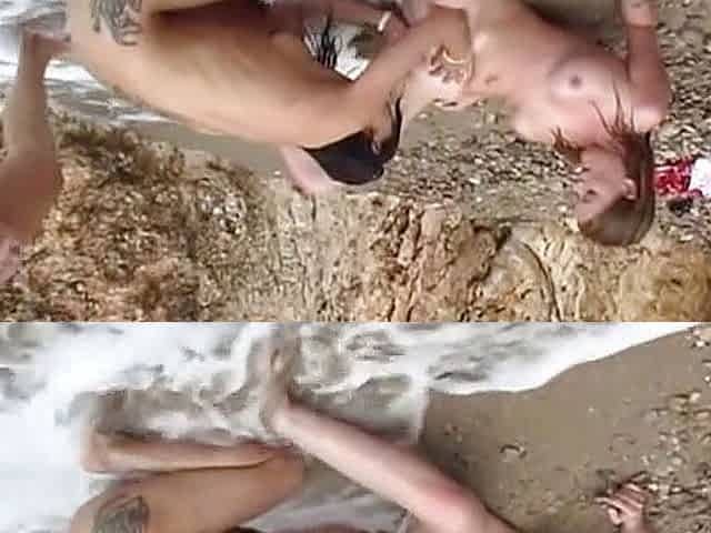 Rough threesome sex on beach rocks