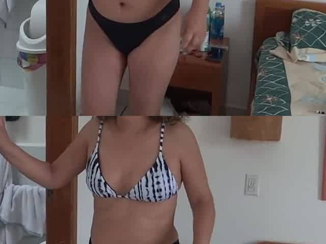 Stepson masturbates watching how stepmother puts on her bikini to go to the beach