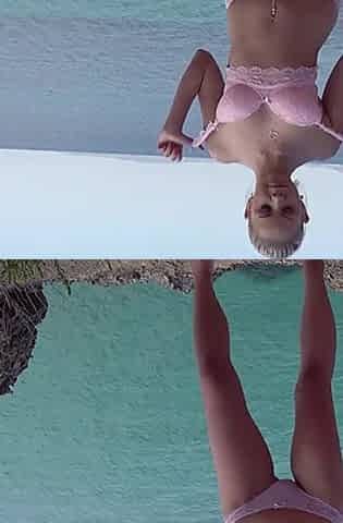 Gorgeous stepmother on the beach shows off in a bikini and touches herself.