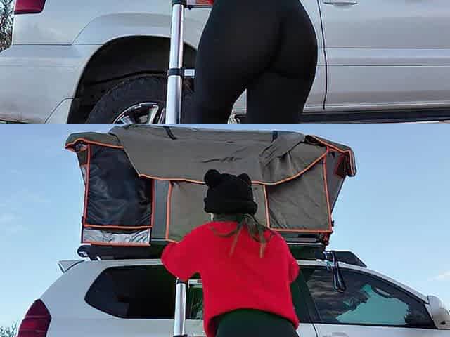 Mountain beauty shows off rooftop tent set up and light up anal-plug