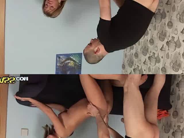 Beauty babe with stunning legs doing a great foot job to her dildo