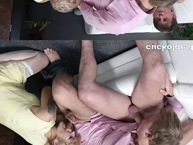 Blonde MILF is having threeway intercourse with two kinky bisexuals