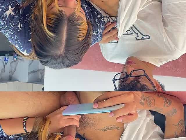 Mi hermanastra me sorprende masturbandome mientras le reviso la galería de su celular.