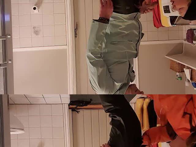 Sucking and jerking off large ramrod in the washroom in oily rainwear and rubber boots